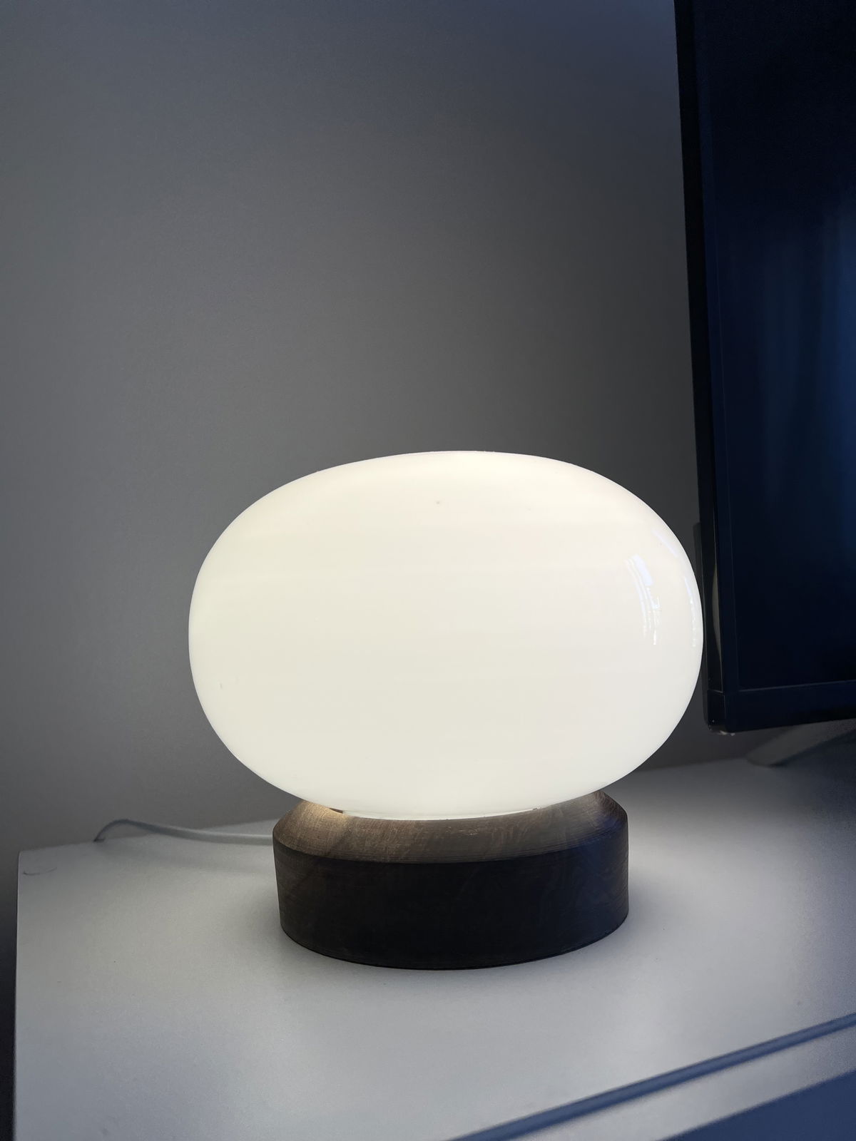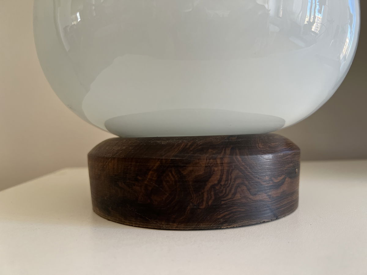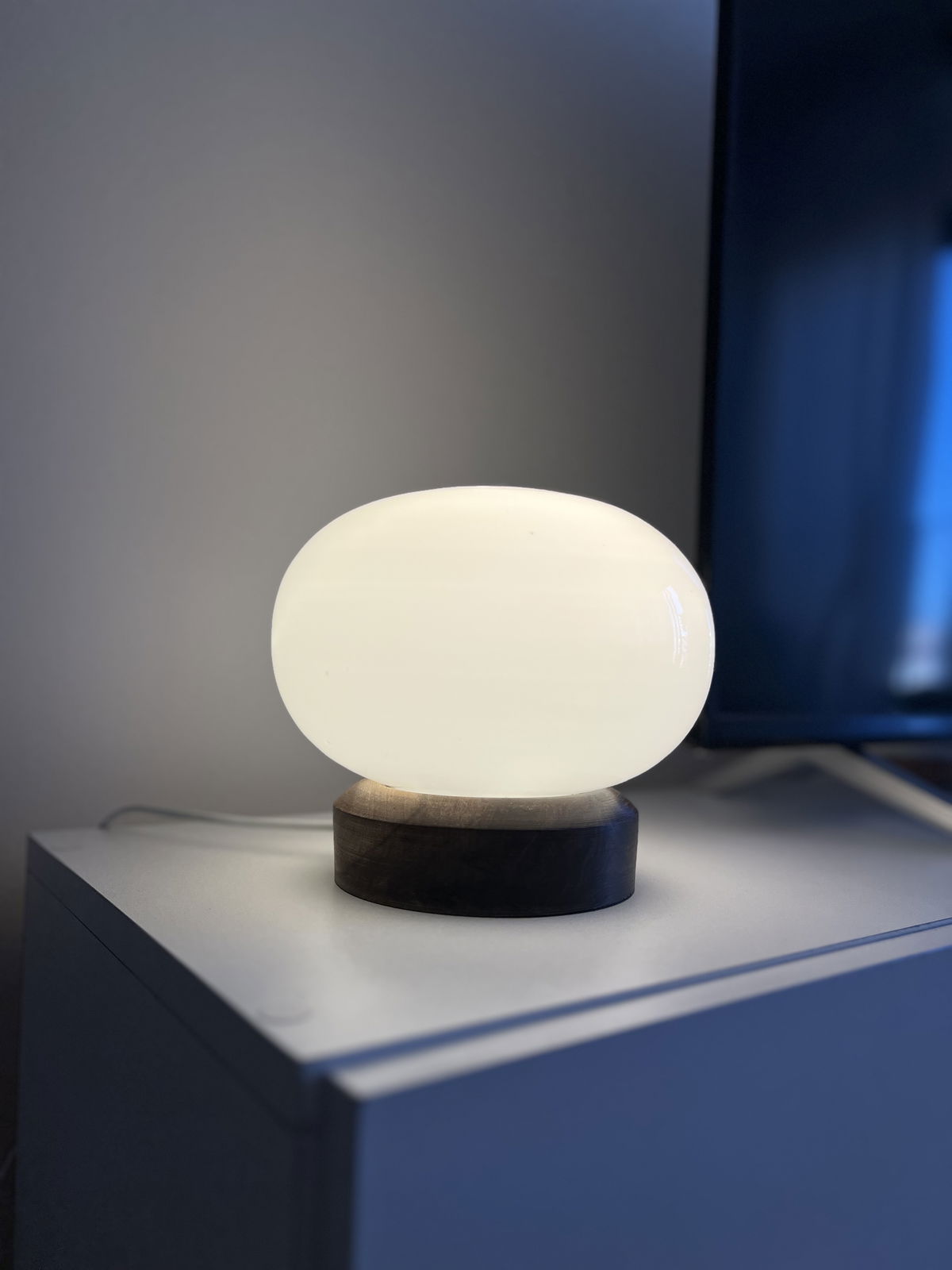 Lámpara de mesa que combina vidrio opal soplado artesanalmente con base de madera Guayubira torneada a mano. Cada pieza presenta variaciones naturales en vetas y tonalidades, lo que la hace única.