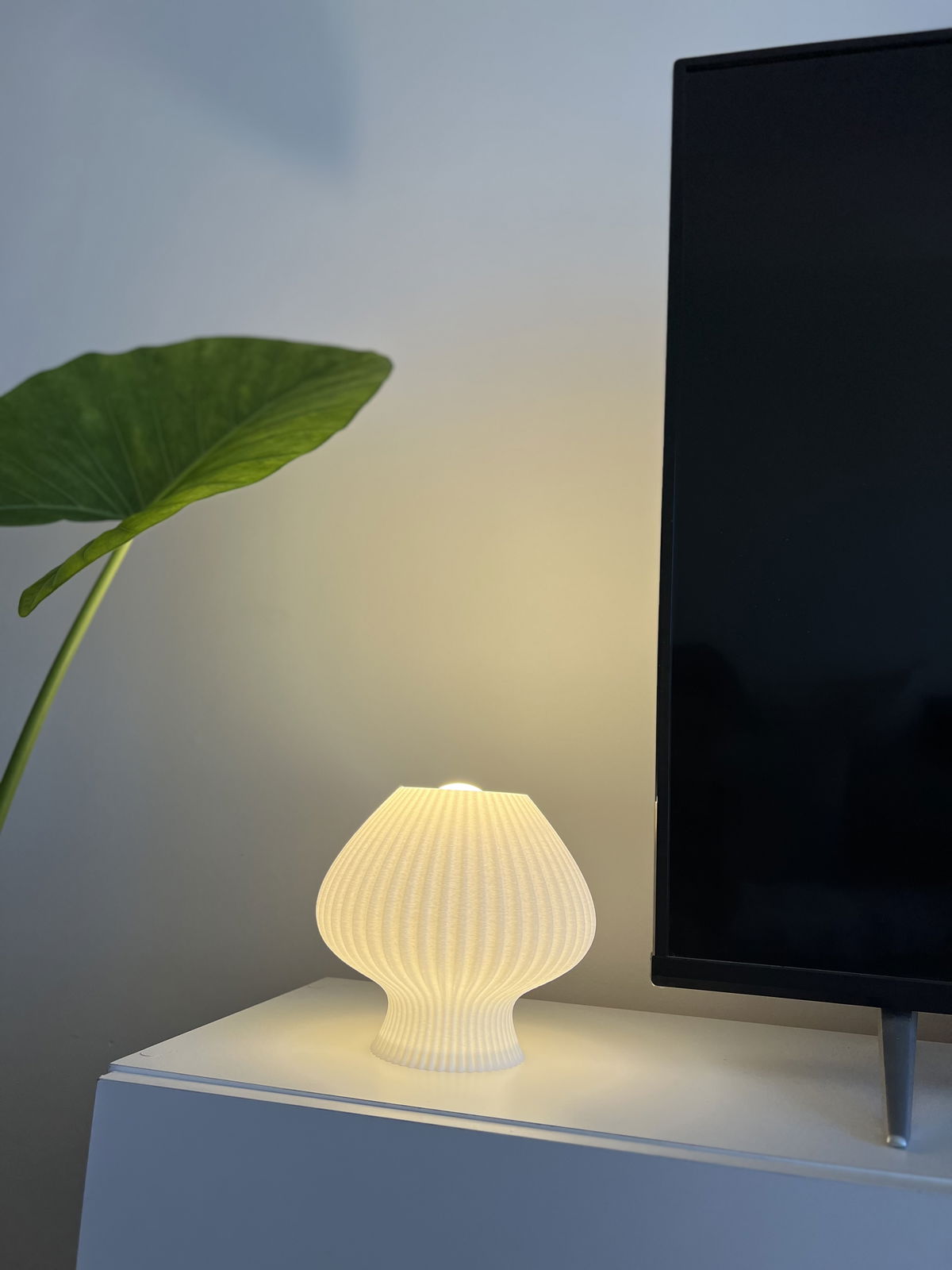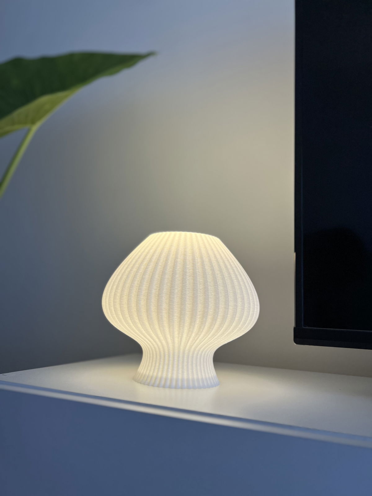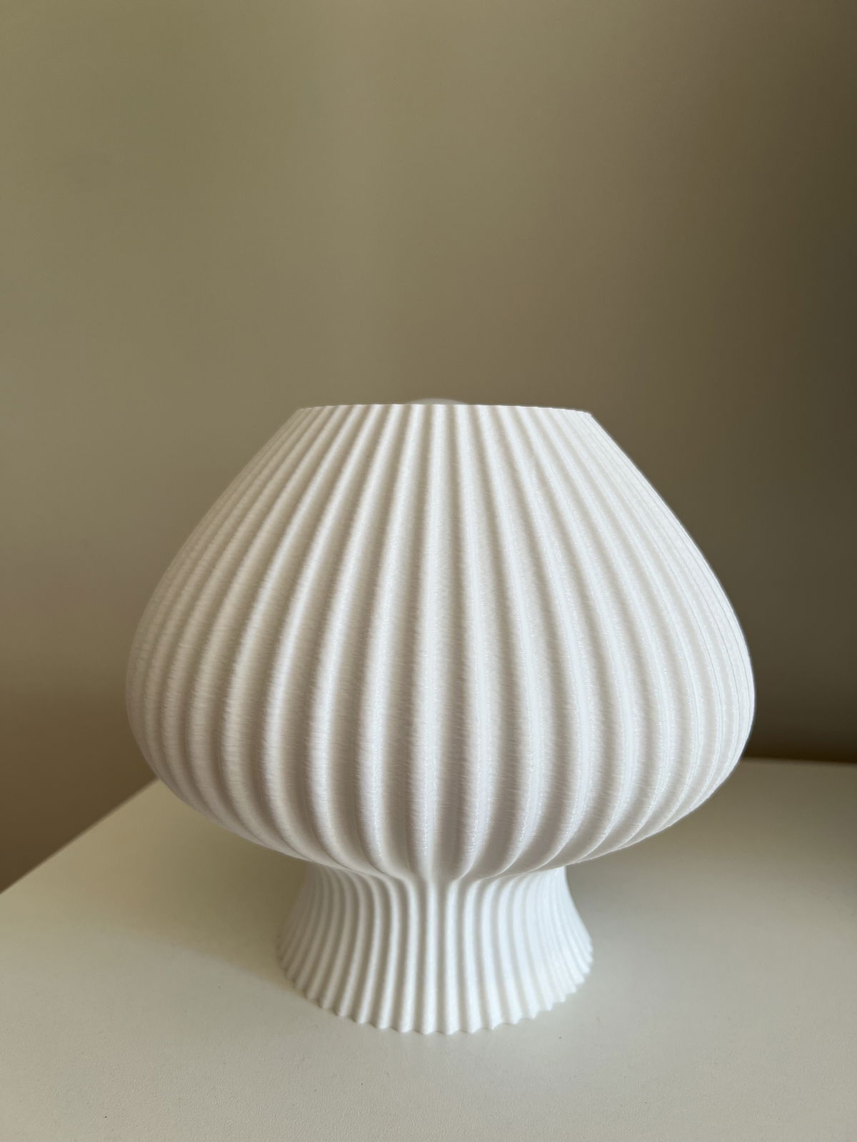 Lámpara de diseño orgánico con textura acanalada en impresión 3D que permite una difusión suave y uniforme de la luz. Fabricada en PLA biodegradable de origen vegetal, un material liviano, resistente y con terminación mate.