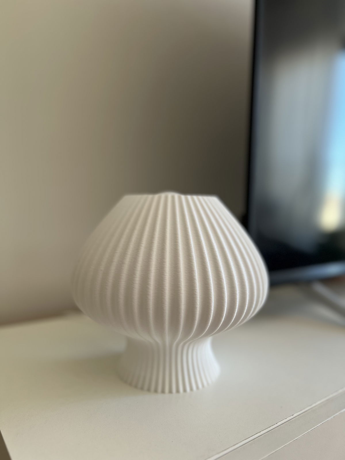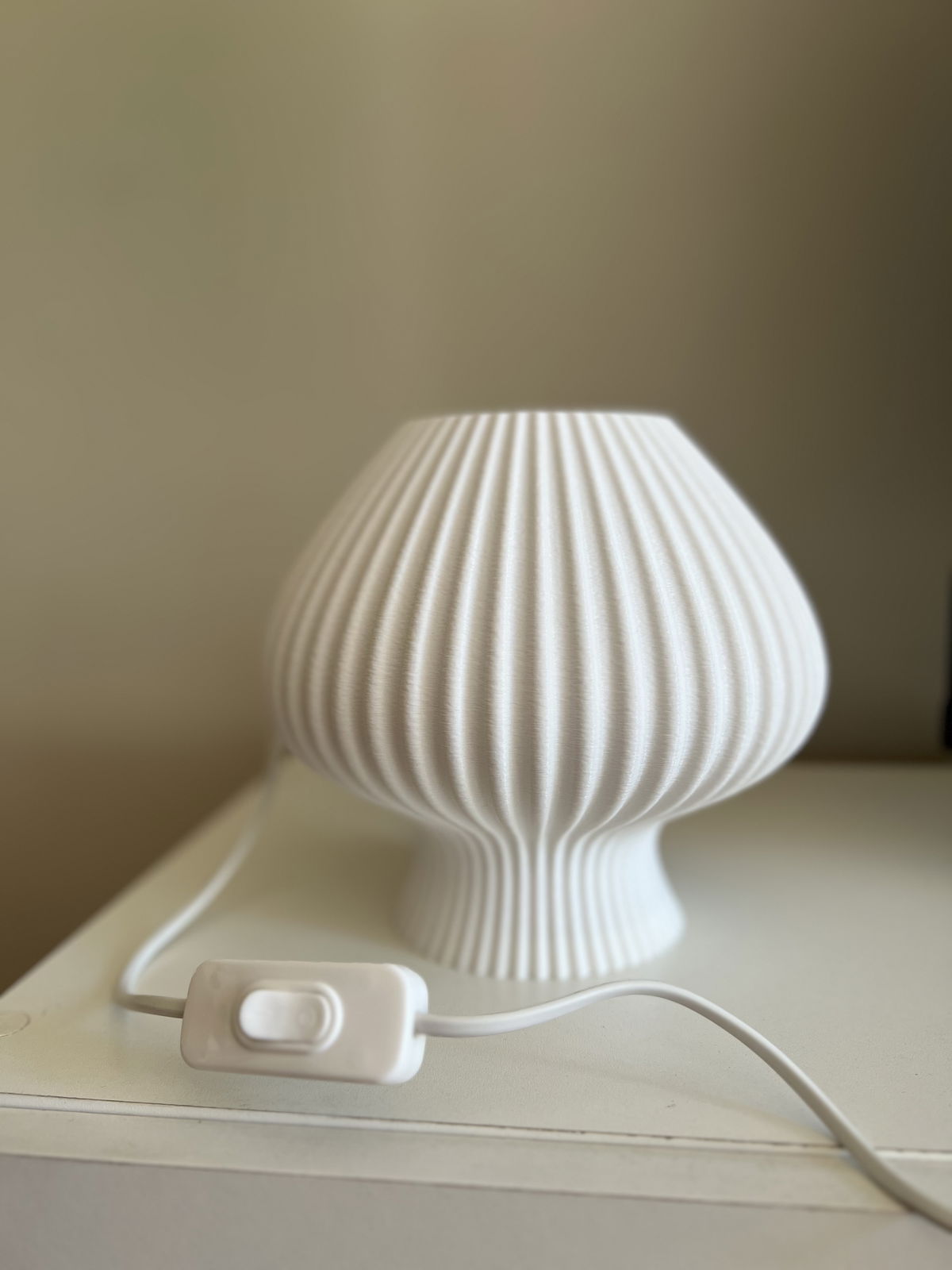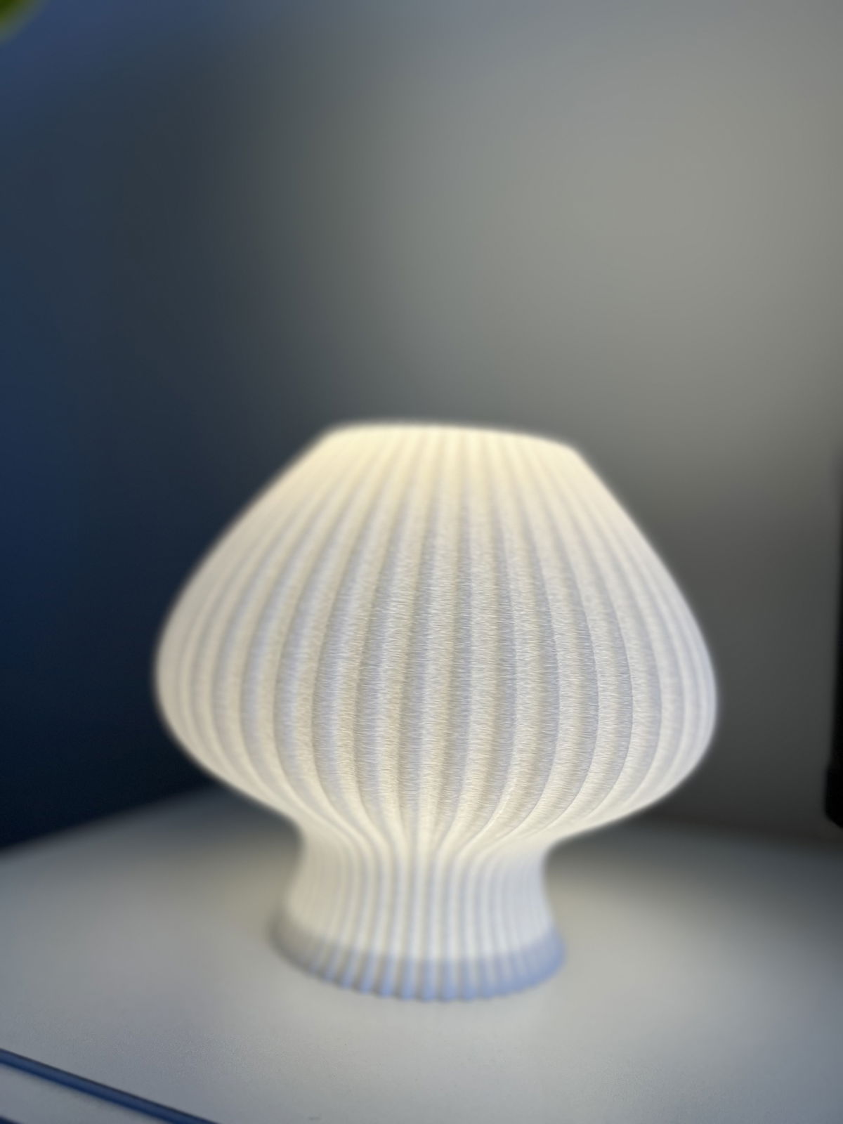 Lámpara de diseño orgánico con textura acanalada en impresión 3D que permite una difusión suave y uniforme de la luz. Fabricada en PLA biodegradable de origen vegetal, un material liviano, resistente y con terminación mate.