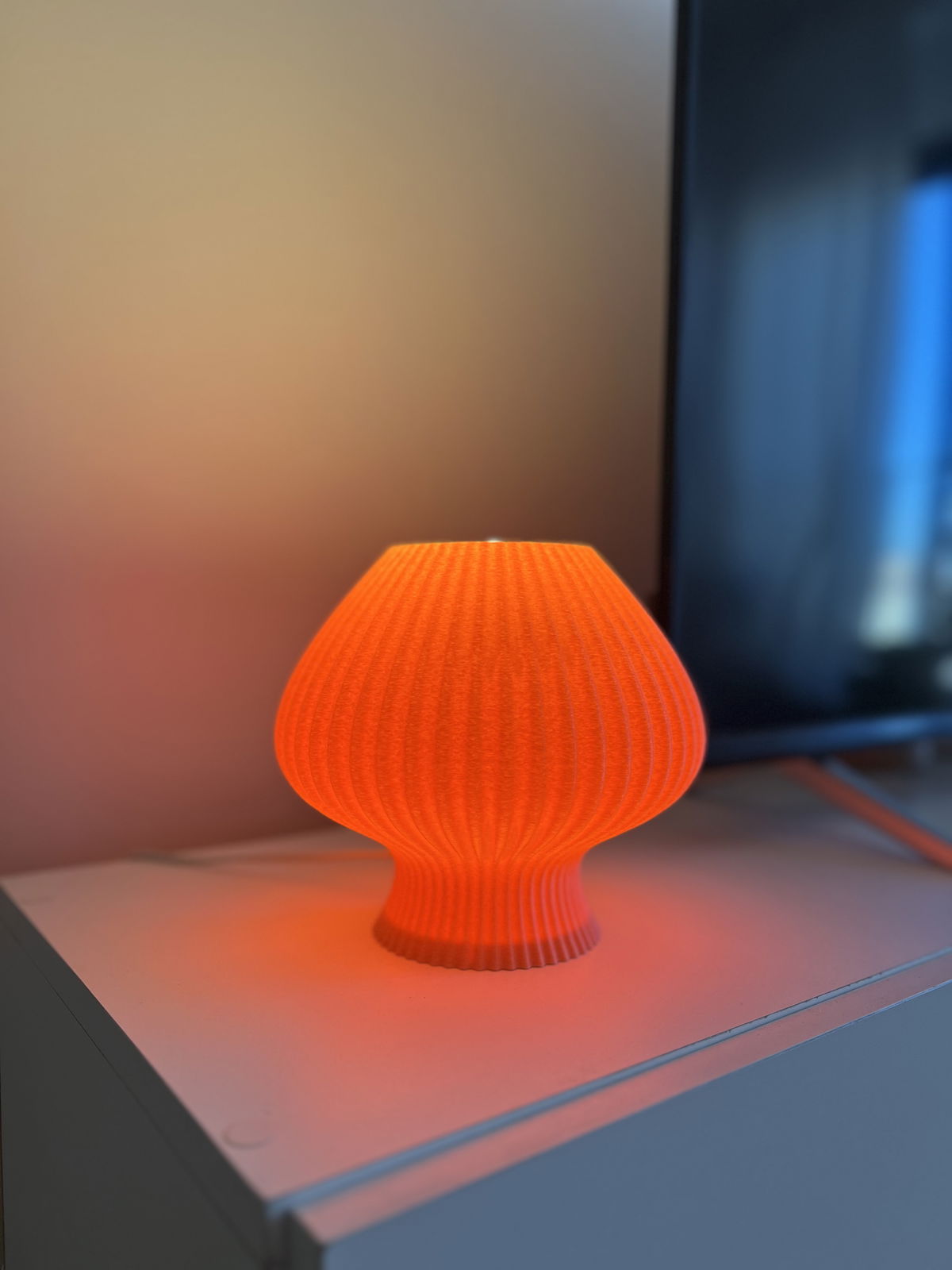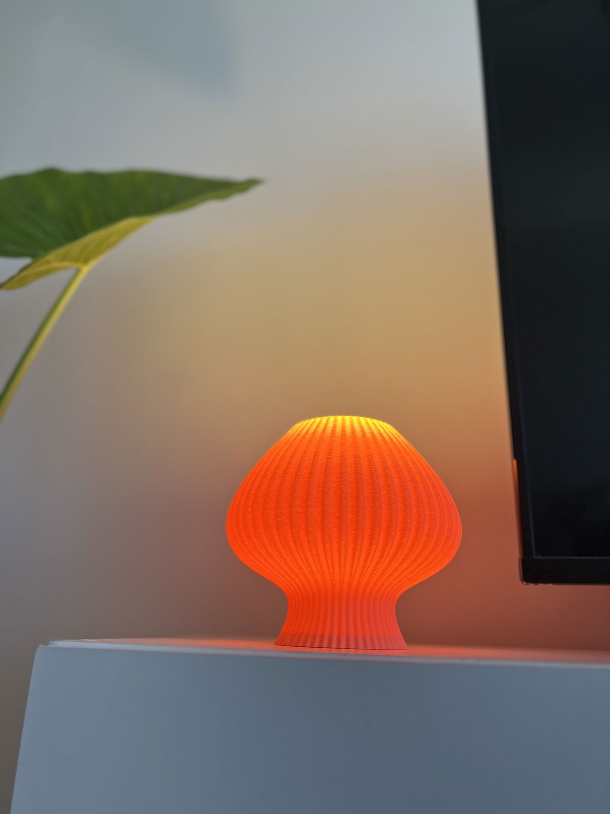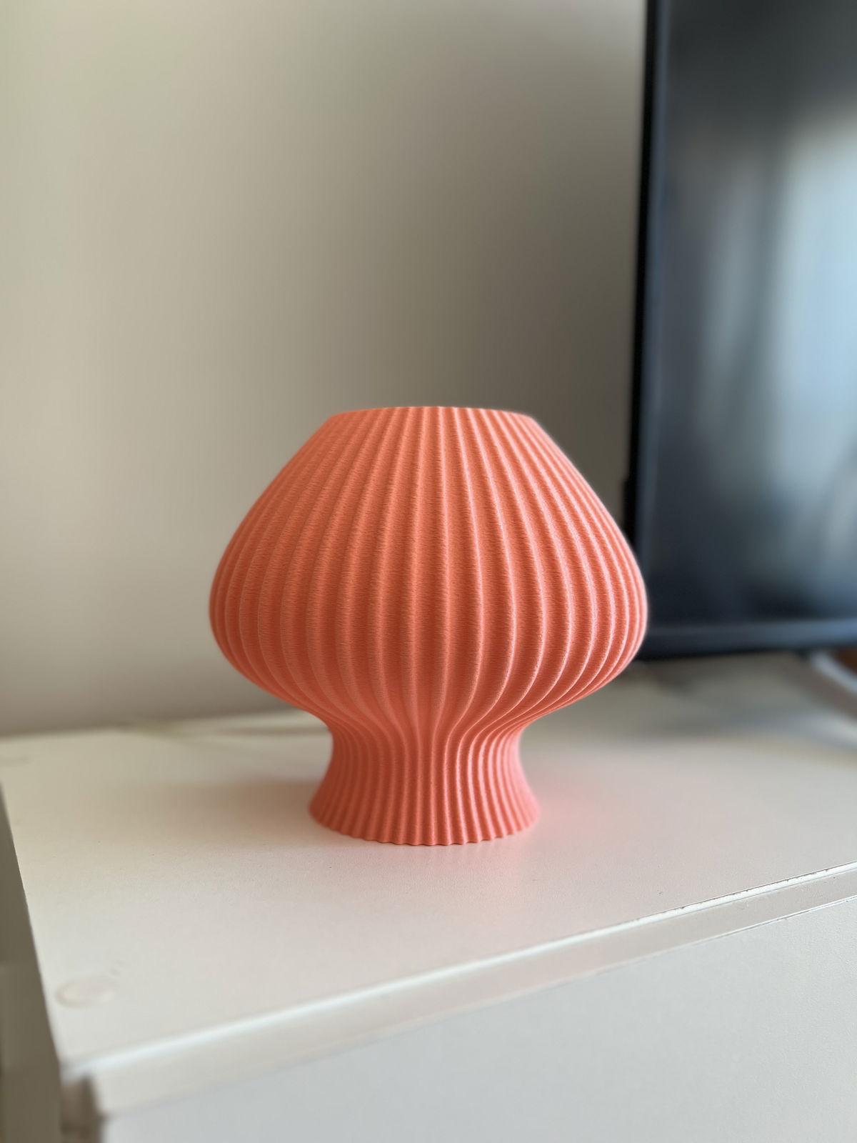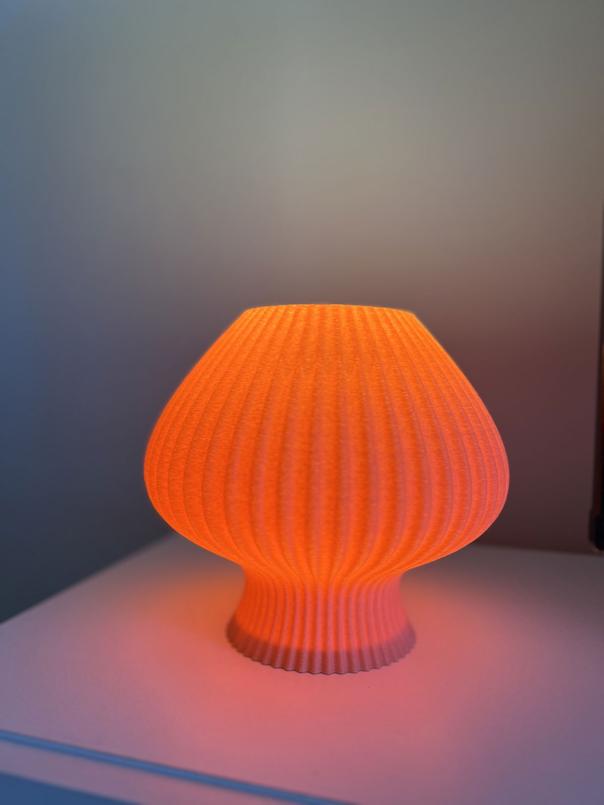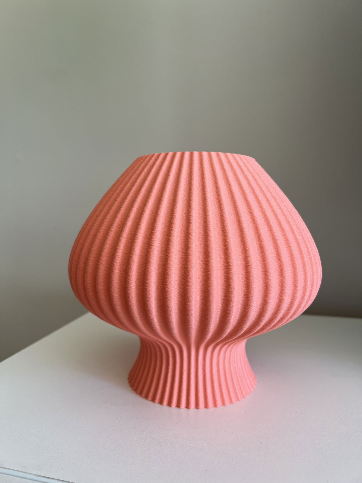 Lámpara de diseño orgánico con textura acanalada en impresión 3D que permite una difusión suave y uniforme de la luz. Fabricada en PLA biodegradable de origen vegetal, un material liviano, resistente y con terminación mate.