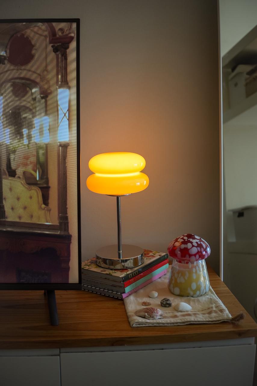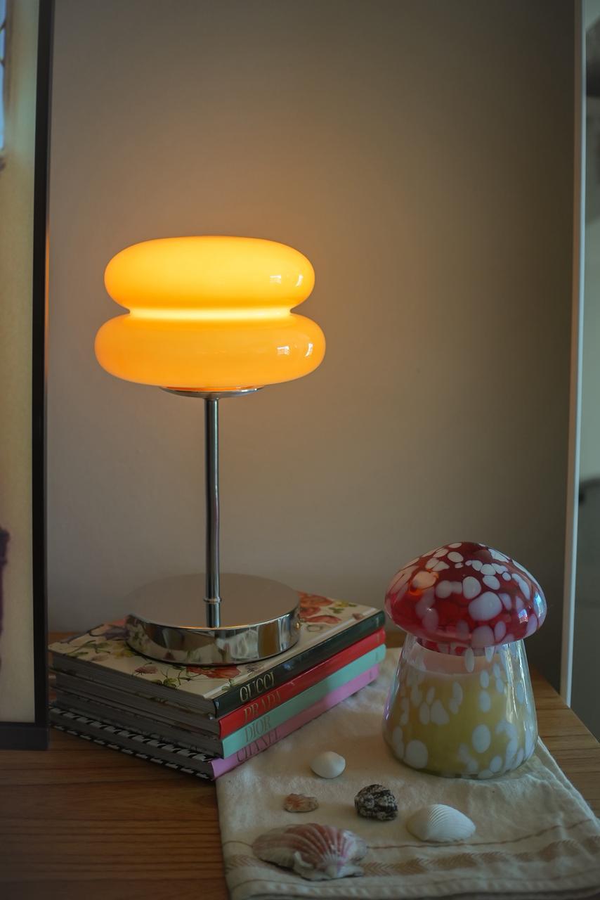 Lámpara de diseño moderno con pantalla de vidrio translúcido que brinda una iluminación suave y cálida, ideal para dormitorios, escritorios o salas de estar. Su base de acabado brillante aporta estabilidad y un estilo elegante que se adapta fácilmente a distintos espacios.
