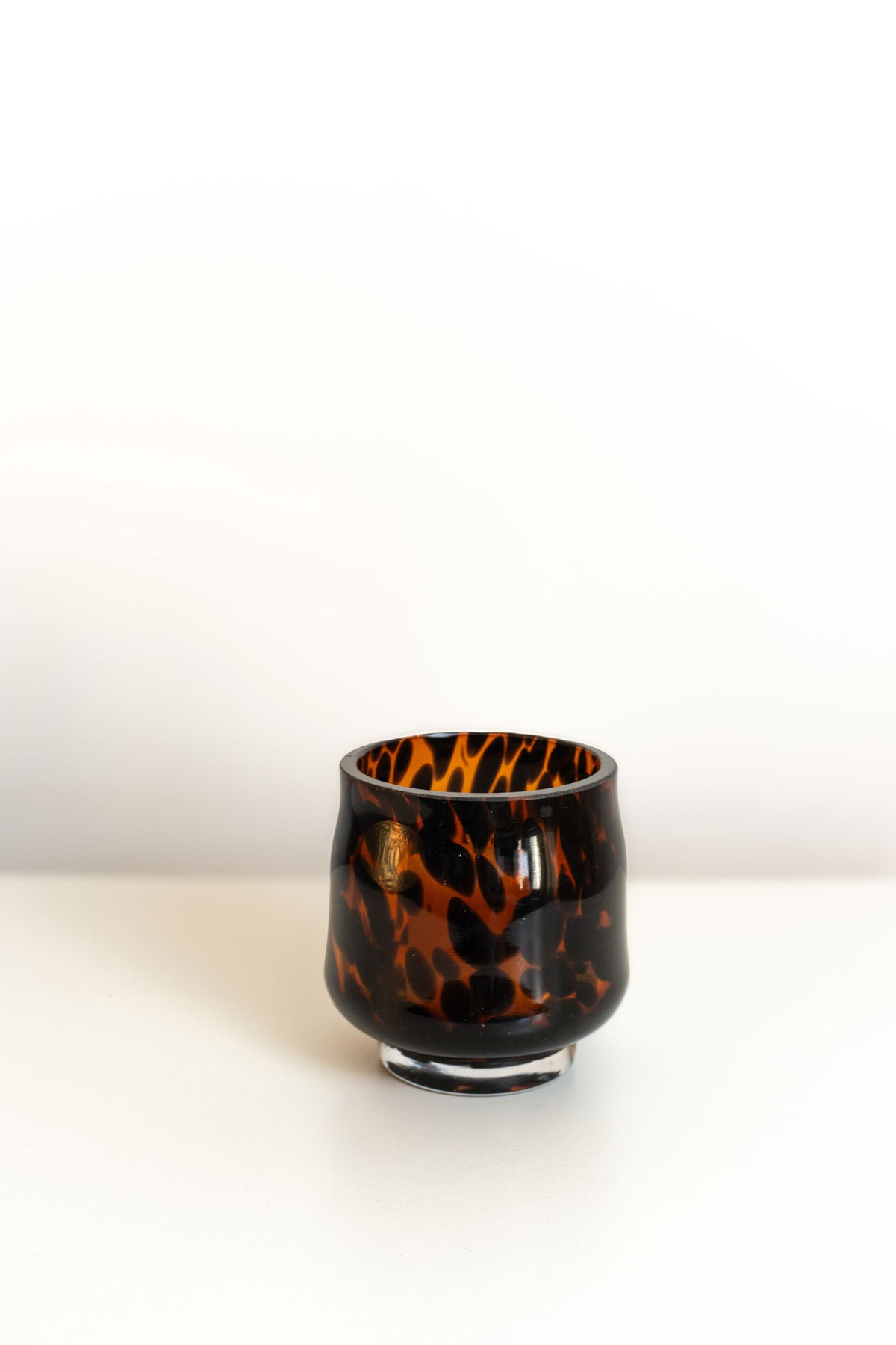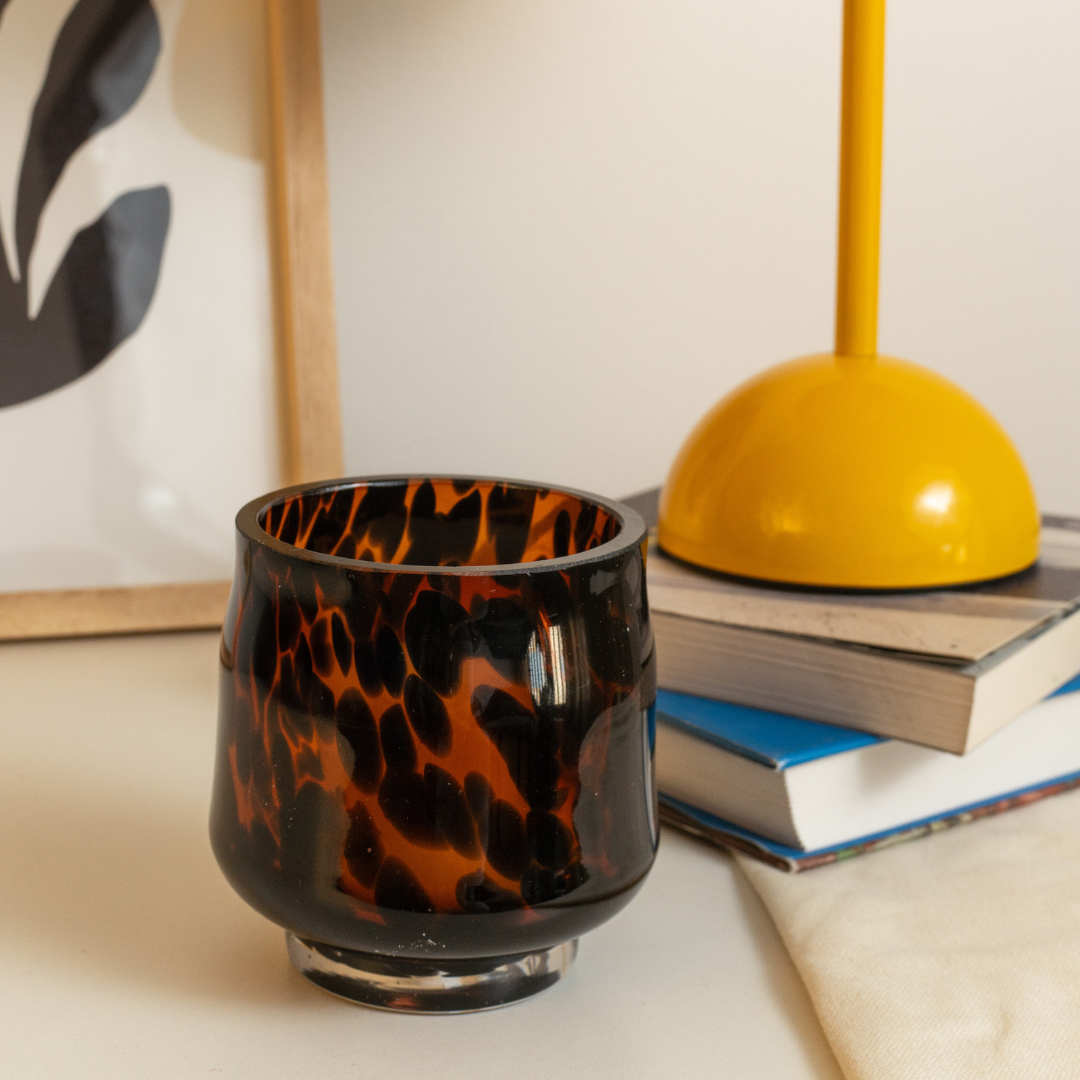 Chiquito pero con toda la onda. El porta velas Leopard combina vidrio con un diseño exótico inspirado en el animal print, ideal para sumar un toque de personalidad y estilo a cualquier rincón de tu casa.