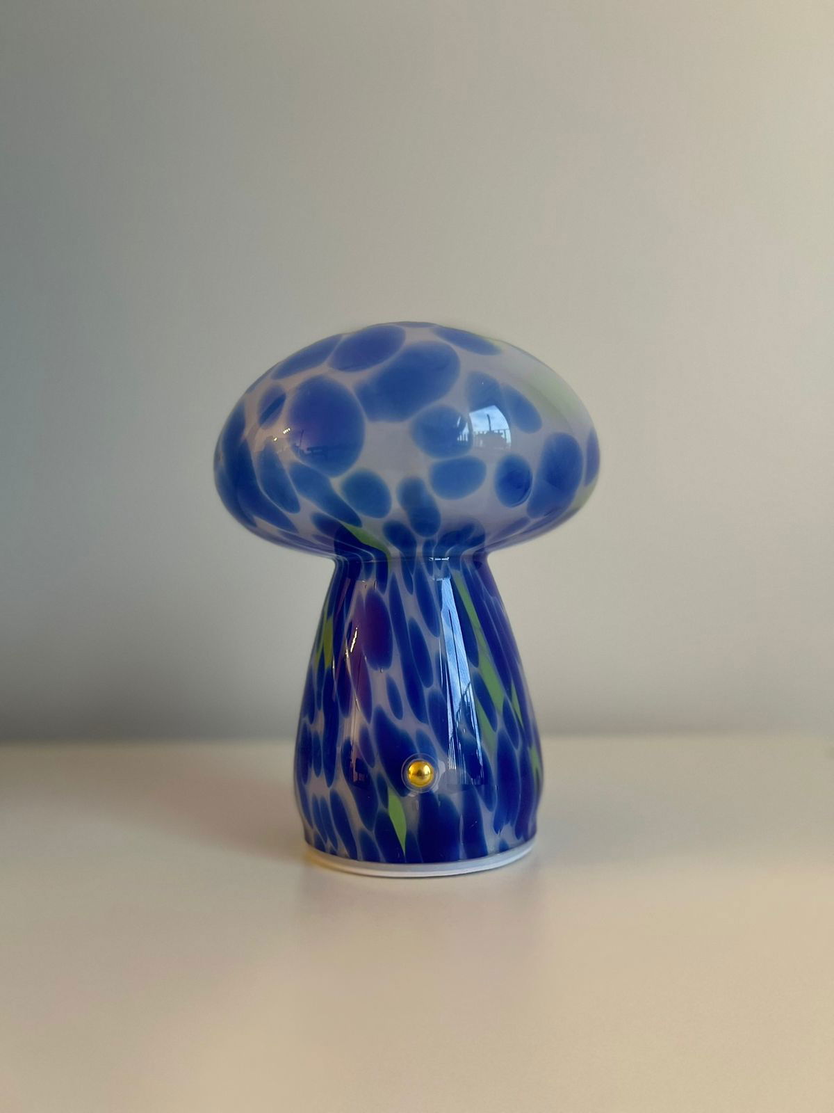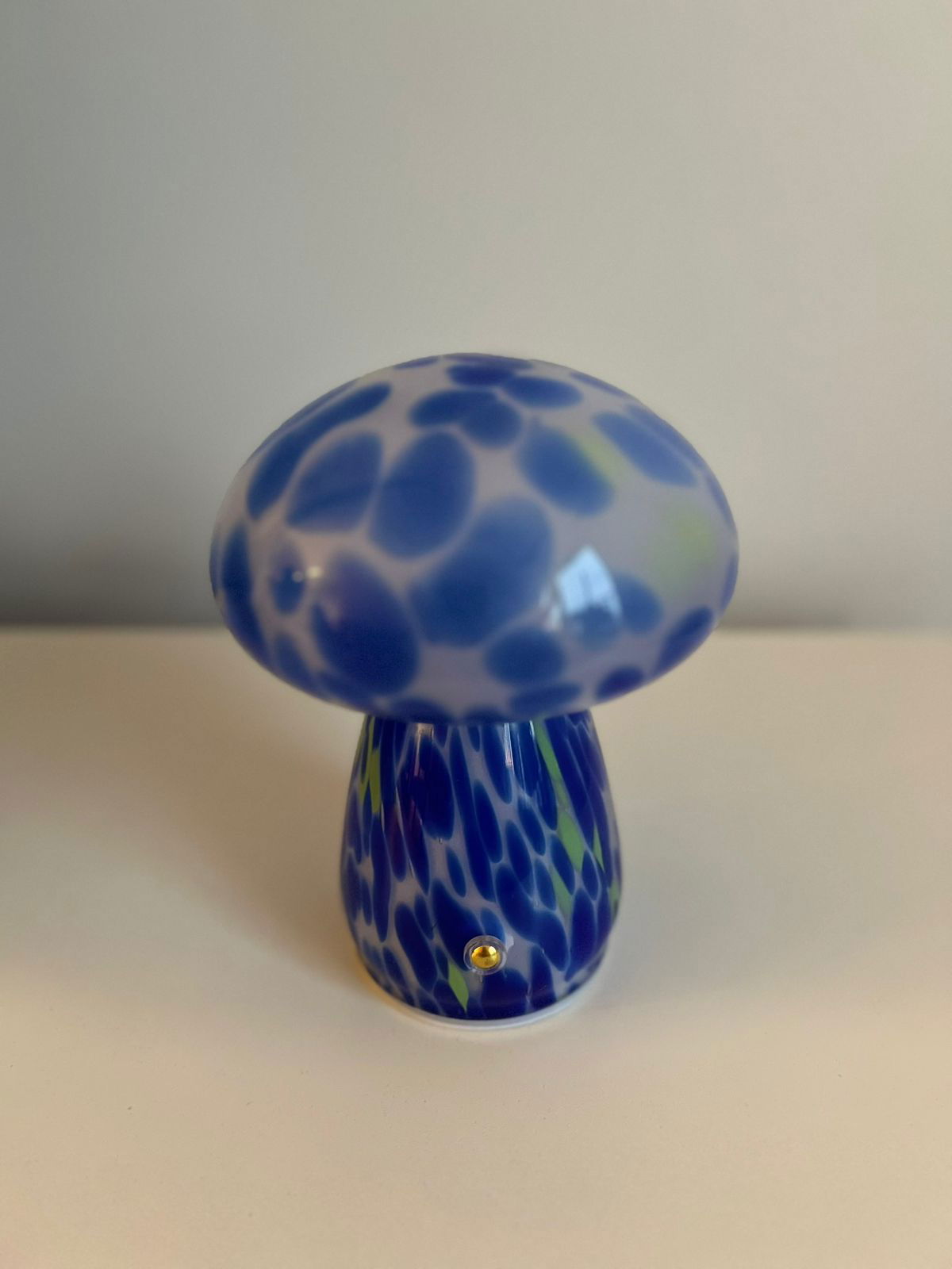 Iluminá tus espacios con estilo y calidez. Su diseño en forma de hongo, realizado íntegramente en vidrio, aporta un toque contemporáneo y delicado, ideal para mesas de luz, estanterías o rincones de lectura.